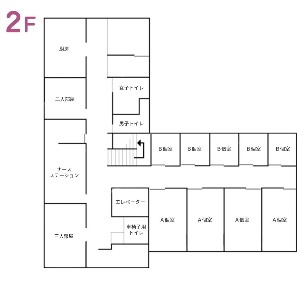 | 設備 | A個室4室 B個室5室 2床室 3床室 ナースステーション CT 一般レントゲン 携帯型超音波検査 携帯型心電図 携帯型内視鏡(胃瘻交換時の確認検査等) 診療室2室 処置室 検査室 浴室(シャワー浴)1室 厨房 EV1基 駐車スペースあり |